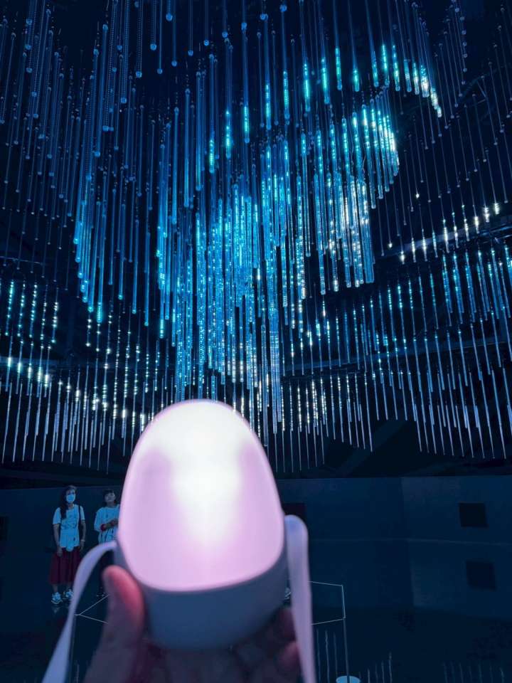 来場者は手に 卵型のデバイス(光の卵) を持って展示を体験します。