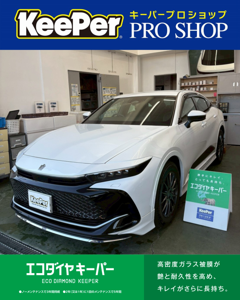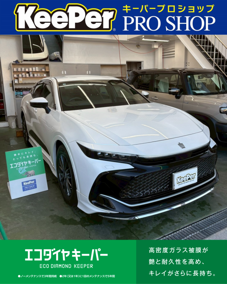 クラウン スポーツは、シャープなプレスラインと ボリューム感のあるフェンダーデザインが特徴的な一台です。 エコダイヤモンドキーパーの被膜が整うことで、 ボディ全体の陰影がよりくっきりと表現され、 高級感のある仕上がりになります。